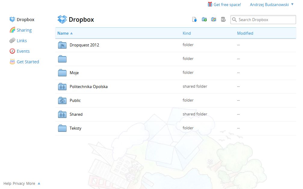 By dostać się do internetowego interfejsu (albo webowego interfejsu, jak kto woli) dropboxa wystarczy zalogować się na ich głównej stronie. Dostaniemy wtedy dostęp do wszystkich plików i katalogów w naszej prywatnej chmurze, możemy z nimi robić wszystko, prócz edytowania zawartości.